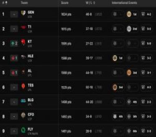 官網更新全球戰(zhàn)隊實力排行榜:GEN第一T1第二,KT升至第三!