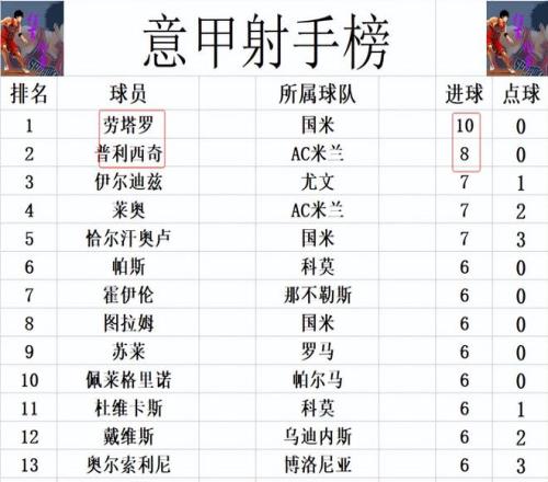 射手榜方面,前十沒(méi)有變化,勞塔羅10球領(lǐng)跑,普利西奇8球緊隨其后。伊爾迪茲,萊奧和恰爾汗奧盧7球并列第3,圖拉姆今天未能進(jìn)球,還是和蘇萊,奧爾索里尼等人6球剛好擠入前十。